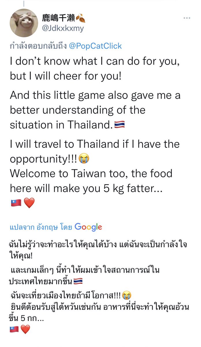 Source: www.beartai.com สำหรับเกมดังกล่าว ได้มีผู้ทำการเข้าคลิกเว็บไซต์ popcat ไปแล้วมากกว่า 5 หมื่น 7 พันล้านครั้ง จากจำนวน 208 ประเทศที่เข้าร่วมการ. หากถามว่า popcat นั้นได้รับความนิยมขนาดไหน แม้แต่ freddy heppell หนึ่งในผู้พัฒนาเกมนี้ยังรู้สึกเซอร์ไพรส์ เมื่อ popcat เป็นเหมือน side project ที่พวกเขาทำขึ้นมาเล่น. ไทยแห่เล่นเกม แมว popcat เจ้าแมวอ้าปากกว้าง แข่งขันจริงจังยิ่งกว่าโอลิมปิก กดคืนเดียวมากกว่า 1 ล้านครั้ง บ้านหวังคว้าอันดับ 1 จากไต้หวันมาครอง. อัปเดต 10 อันดับแรก จิ้มแมวรัวๆ เกม popcat ชาวเน็ตไทยร่วมใจต่อสู้ จนพุ่งติดอันดับ 2 ของโลกแล้ว. พลังคลิกชาวไทยผงาด พาอันดับของประเทศพุ่งติดอันดับ 3 ในเกม popcat ภายใน 13 ชั่วโมง ตามหลังมาเลเซีย และไต้หวัน สำหรับใครที่เล่นเฟซบุ๊ค หรือทวิตเตอร.